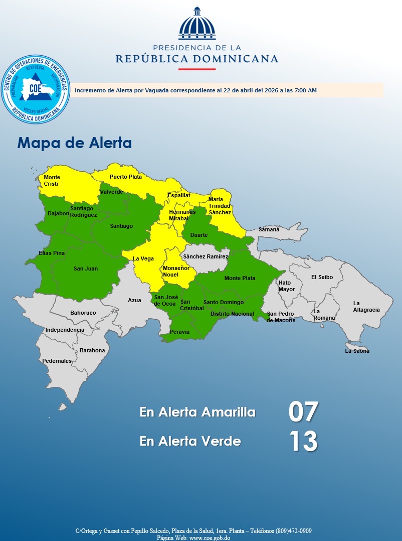 Entre las provincias en alerta amarilla figuran Puerto Plata, Montecristi, Espaillat, María Trinidad Sánchez, Hermanas Mirabal, La Vega y Monseñor Nouel. En tanto, en alerta verde se encuentran San Juan, Elías Piña, San José de Ocoa, Valverde, San Cristóbal, Santiago Rodríguez, Duarte (especialmente el Bajo Yuna), Monte Plata, Dajabón, Santiago, Peravia, la provincia Santo Domingo y el Distrito Nacional.