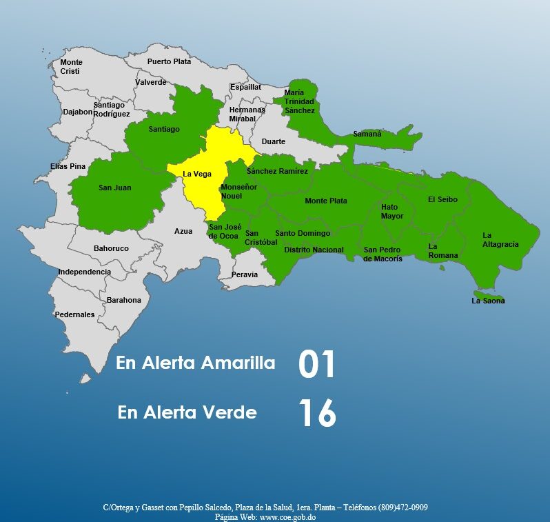 Santo Domingo.- The Emergency Operations Center (COE) maintains the yellow alert for rains in La Vega and the green alert in a total of 16 provinces of the Dominican territory due to the passage of a tropical wave associated with a low-pressure center located hundreds of kilometers south of Puerto Rico, the institution reported this Monday.