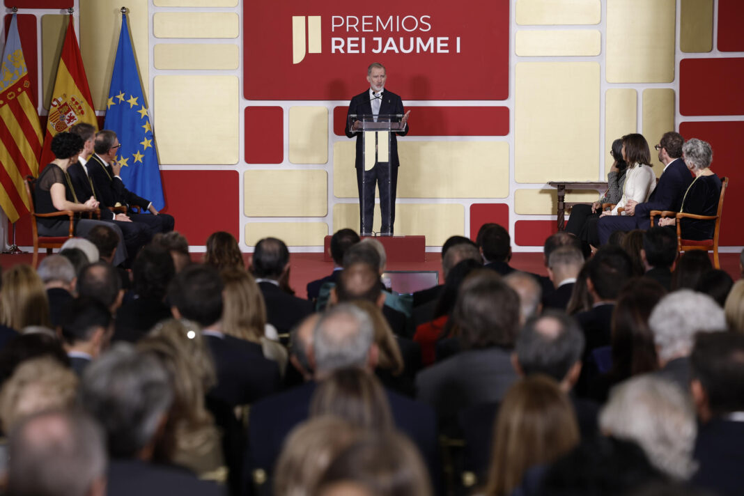 Felipe VI, who presided over the ceremony for the presentation of the thirty-seventh edition of the Rei Jaume I 2025 Awards at the Lonja de los Mercaderes in Valencia (east), which was not attended by the acting president of the Valencian Government, Carlos Mazón, began his speech with a remembrance of those affected by the storm in October of last year.