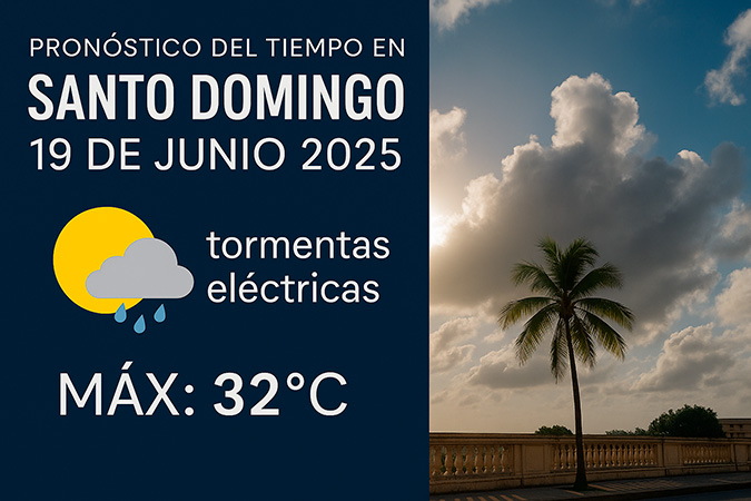 Santo Domingo.- The weather forecast in Santo Domingo today, June 19, 2025 anticipates a mild day in the morning, followed by rain and thunderstorms from the central and southern areas of the city during the afternoon, with maximum temperatures of up to 32 °C.