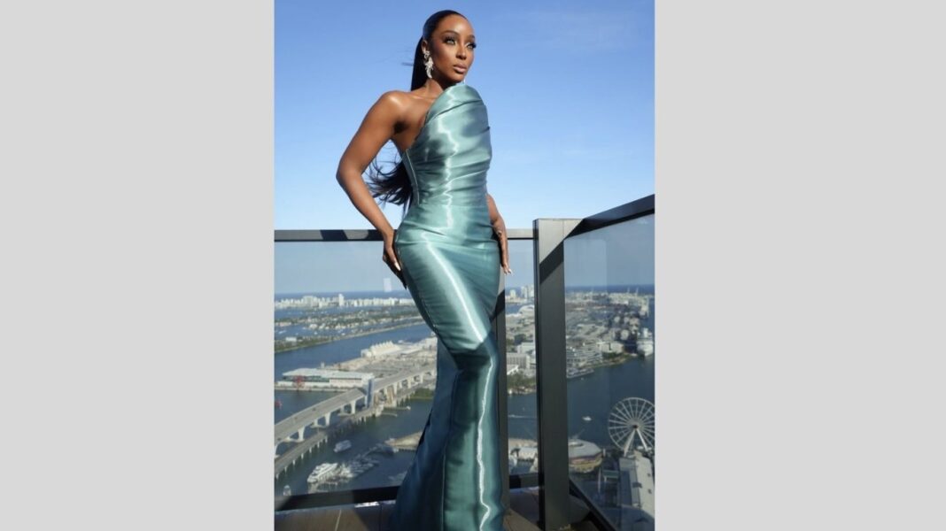 En la gala celebrada en el Kaseya Center en Miami, la artista dominicana apostó por un vestido de silueta columna en tono verde jade con matices aqua, confeccionado en una tela satinada de acabado técnico y microtextura visible que capturaba la luz con un efecto casi líquido.