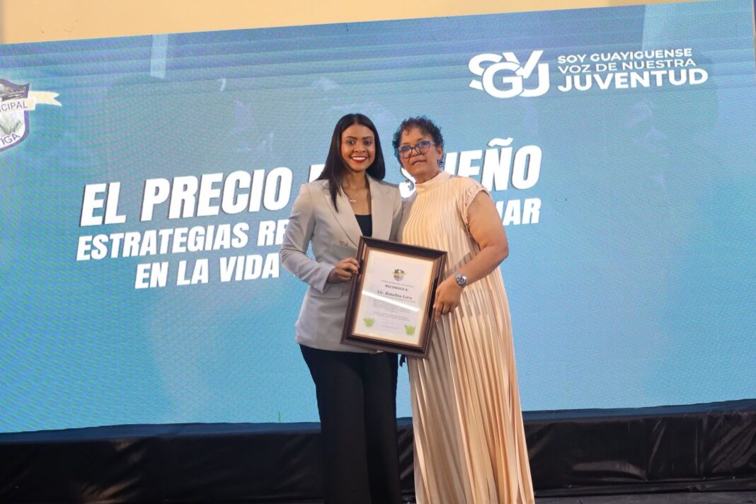 Santo Domingo.– La periodista y locutora Rosalina Lora fue reconocida por la Junta del Distrito Municipal de La Guáyiga, del municipio de Pedro Brand, por su destacada labor periodística y por ser un referente para la juventud de esa localidad, en el marco de la celebración del Día Nacional de la Juventud.