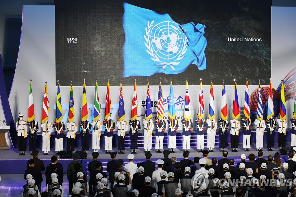 Luego, se exhibieron las banderas de los 22 países que ayudaron a Corea del Sur en el conflicto junto a las de Corea del Sur y de la ONU. También tuvieron lugar varias actuaciones en honor a aquellos que lucharon bajo la bandera de la ONU durante el conflicto bélico de tres años.