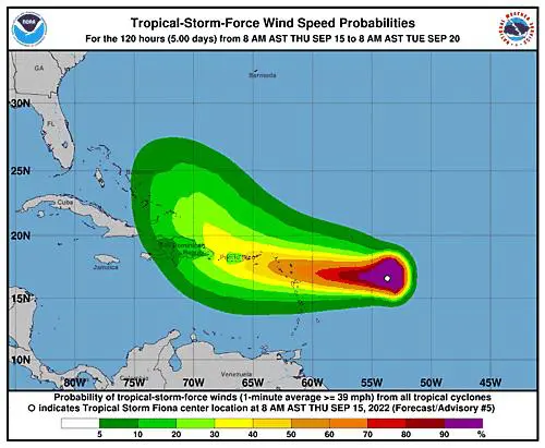 En la trayectoria pronosticada, el centro de Fiona debe alejarse gradualmente de las Islas Turcos y Caicos esta noche y durante el miércoles, y acercarse a las Bermudas este jueves por la noche.