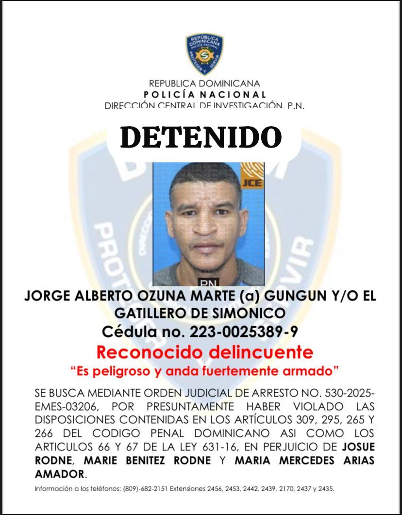 Santo Domingo.- La Policía Nacional informó este sábado de la captura de Jorge Alberto Ozuna Marte, alias Gungún, señalado como uno de los presuntos autores del ataque a tiros del 11 de diciembre de 2025 en el sector Villa Duarte, hecho en el que murieron un niño de 10 años y una mujer, y otra fémina resultó herida.