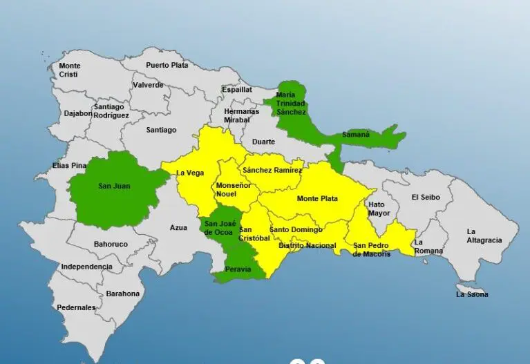 Mientras que en alerta verde se encuentran San Juan, San José de Ocoa, Peravia, María Trinidad Sánchez y Samaná.