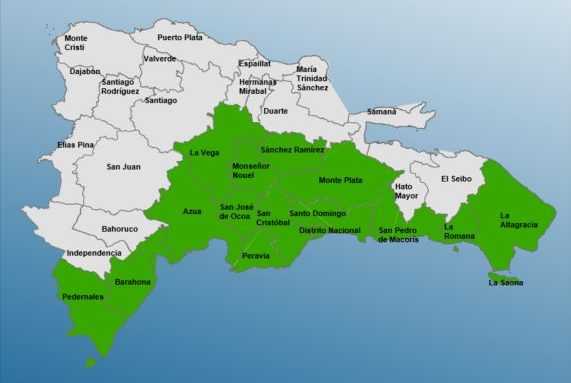 Las provincias que el COE puso en alerta verde son La Altagracia, San Pedro de Macorís, San Cristóbal, Monte Plata, Monseñor Nouel, Peravia, Barahona, La Romana, Santo Domingo, Distrito Nacional, La Vega, Sánchez Ramírez, Azua, Pedernales y San José de Ocoa.