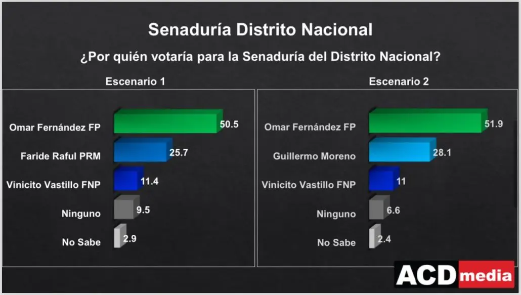 El legislador de la Fuerza del Pueblo fue favorecido por un 50.5% de los encuestados frente a un 25.7% de Faride Raful por el PRM y aliados, mientras que en tercera y última posición se encuentra Vinicio Castillo por el Partido Reformista Social Cristiano (PRSC) con un 11.4%, un 9.5% por ninguno y un 1.9% no sabe por quien votaría.