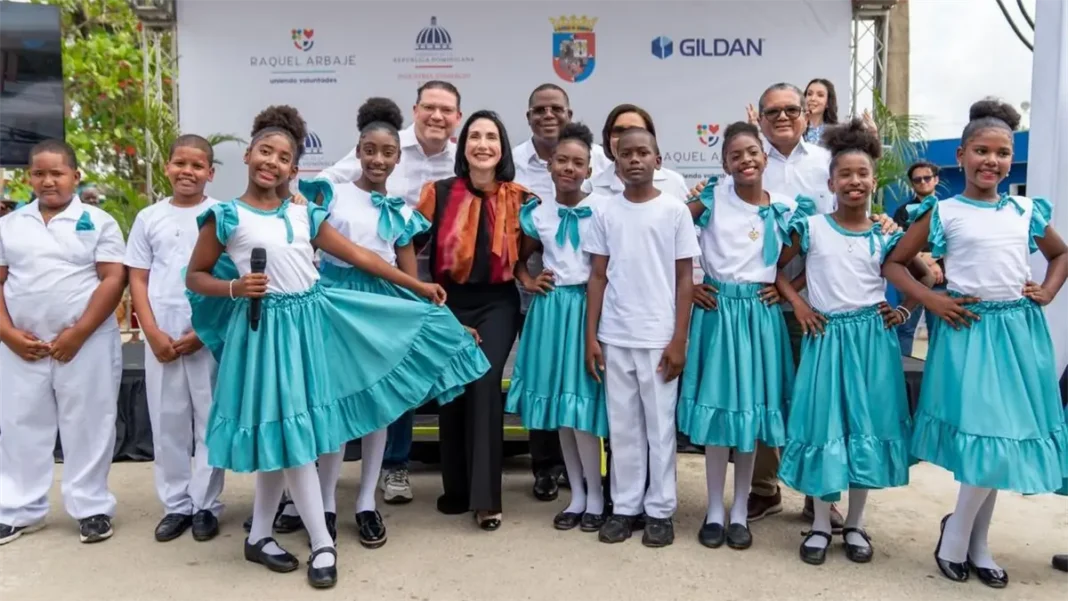 San Antonio de Guerra.– La primera dama, Raquel Arbaje; el ministro de Industria, Comercio y Mipymes (MICM), Yayo Sanz Lovatón, y Arquímedes George, vicepresidente y gerente país de Gildan República Dominicana, entregaron un parque infantil nuevo y un campo de béisbol remozado en la comunidad de Bella Vista, municipio San Antonio de Guerra, en la provincia Santo Domingo.