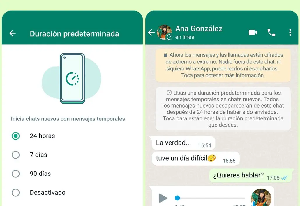 Según la página web oficial de la plataforma de mensajes, una persona puede elegir la activación de mensajes temporales en todos los chats o únicamente en aquellas conversaciones que sean seleccionadas. Si los usuarios desean activar en un chat existente, la información previa se mantendrá dentro del historial y la configuración opcional solo incluirá a los textos que se envíen luego de haberla establecido.